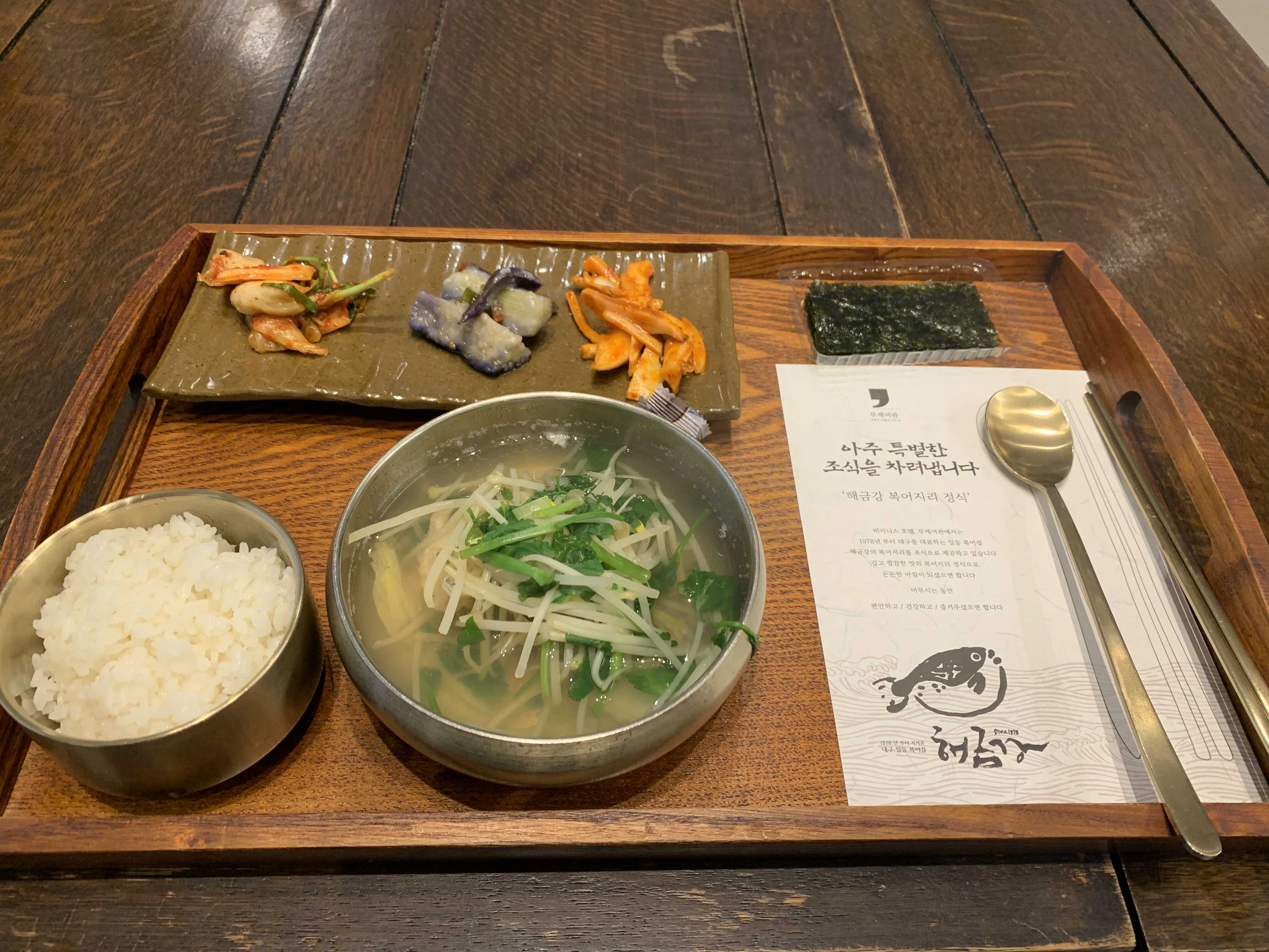 짠. 조식의 모습입니다. 국물은 정말 짭짤했습니다. 조금 덜 짰으면 좋을 것 같았는데, 그래도 조식은 만족스러웠습니다. 깔끔하게 제공되어서 좋았답니다. 반찬 3가지, 김, 쌀밥, 복어 지리탕이 나옵니다. 아침에 뜨끈한 국물을 먹으니 너무 좋더라고요! 근데 1층 카페 겸 조식 장소로 사용되는 곳이 좁아서 여기서 투숙객이 어떻게 밥을 다 먹나 싶더라고요.
