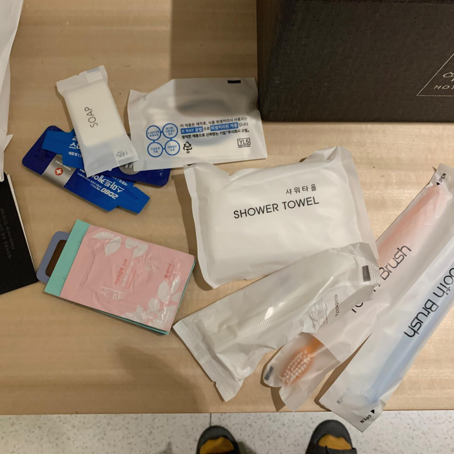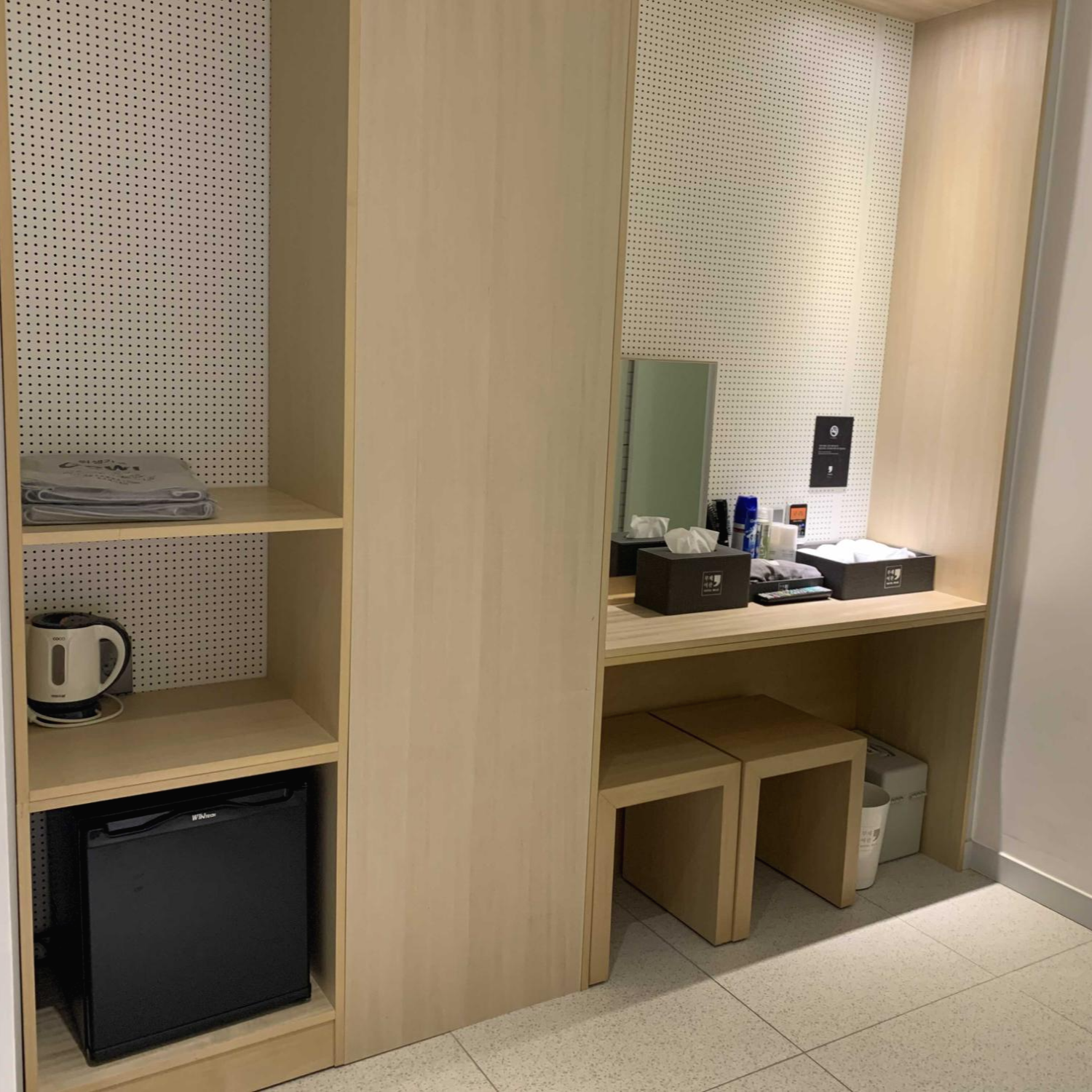 가운, 포트, 냉장고(냉장고 안에는 음료수와 물이 구비되어 있습니다.), 화장대, 수건, 빗, 스프레이, 미스트가 구비되어 있더라고요. 그리고 칫솔, 면봉 등이 들어가 있는 키트가 제공되었습니다.